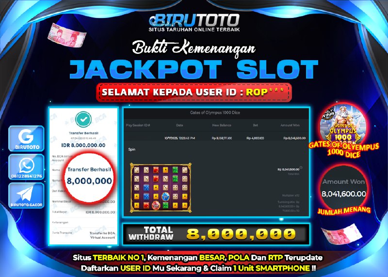 BIRUTOTO JACKPOT SLOT GATES OF OLYMPUS 1000 DICE Rp.8.000.000 LUNAS