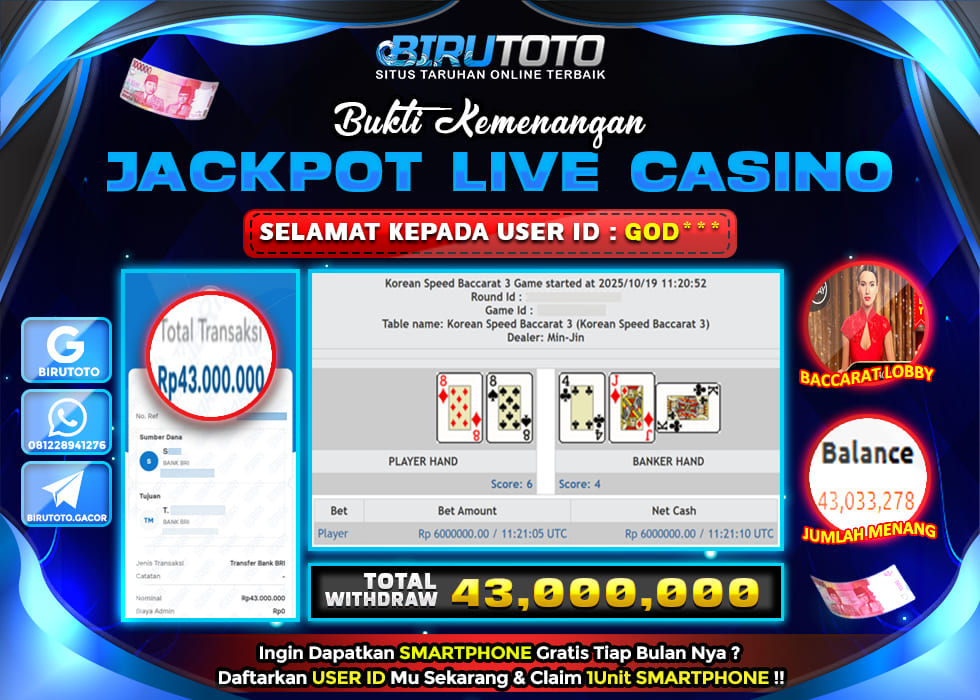 BIRUTOTO JACKPOT LIVE CASINO BACCARAT Rp.43.000.000 LUNAS