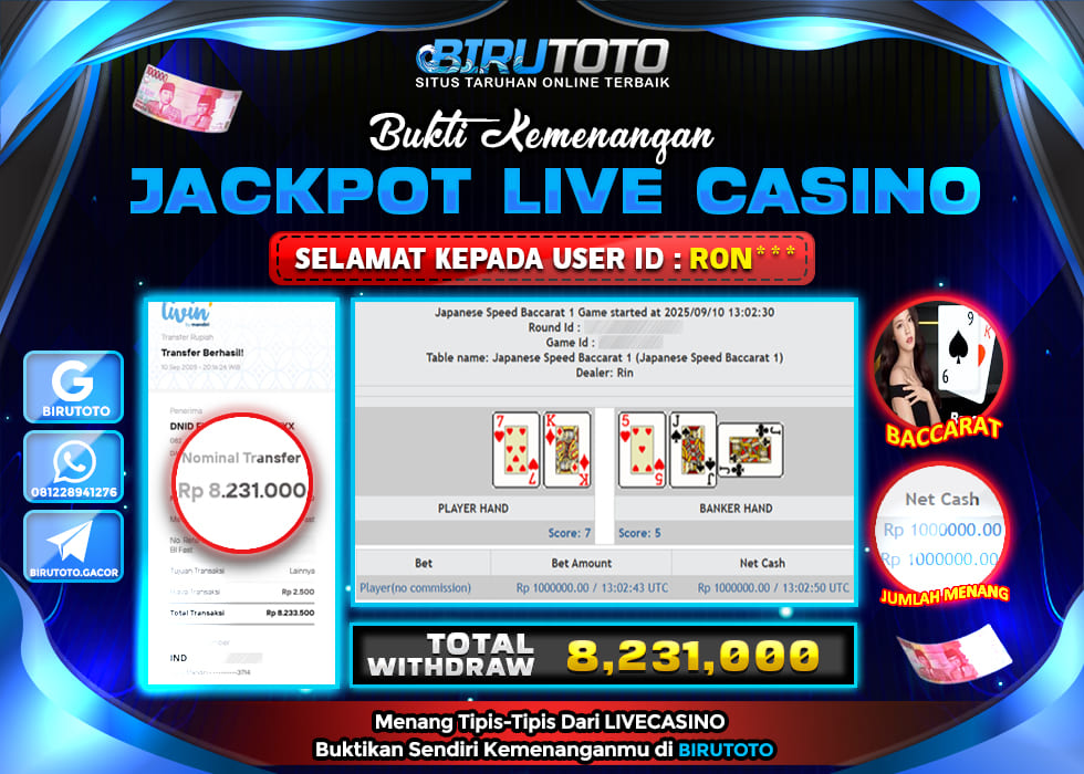 BIRUTOTO JACKPOT LIVE CASINO BACCARAT Rp.8.231.000 LUNAS