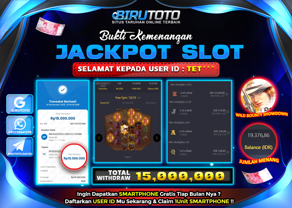 Selamat Kepada Member BIRUTOTO TE**** Telah Jackpot Di SLOT WILD BOUNTY SHOWDOWN