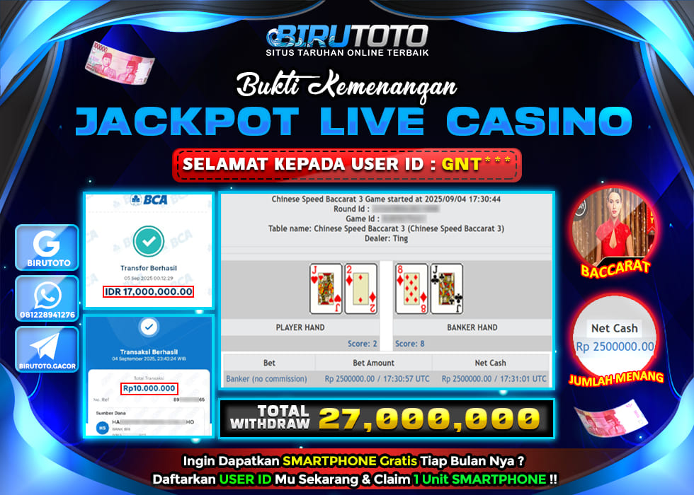 Selamat Kepada Member BIRUTOTO GN**** Telah Jackpot Di LIVE CASINO BACCARAT