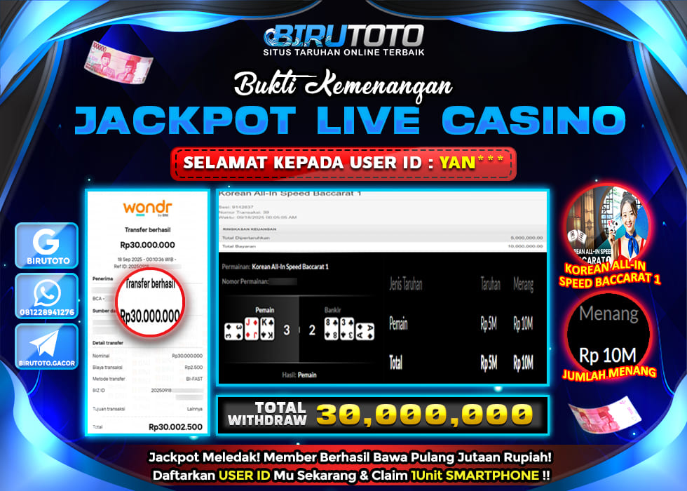 Selamat Kepada Member BIRUTOTO YA**** Telah Jackpot Di LIVE CASINO KOREAN ALL-IN SPEED BACCARAT 1