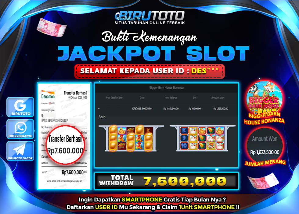 BIRUTOTO JACKPOT SLOT BIGGER BARN HOUSE BONANZA Rp.7.600.000 LUNAS