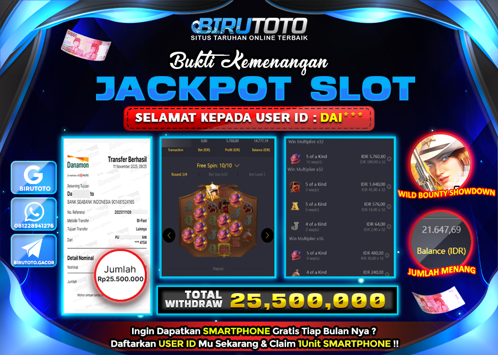 Selamat Kepada Member BIRUTOTO CAN**** Telah Jackpot Di SLOT WILD BOUNTY SHOWDOWN