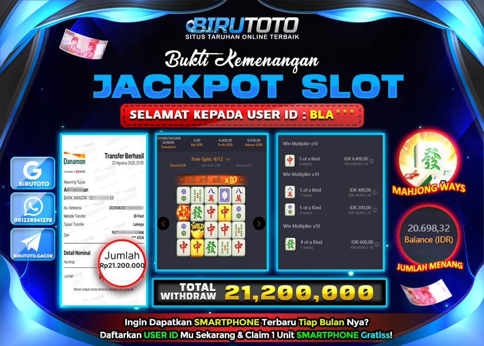Selamat Kepada Member BIRUTOTO WA**** Telah Jackpot Di SLOT MAHJONG WAYS 2