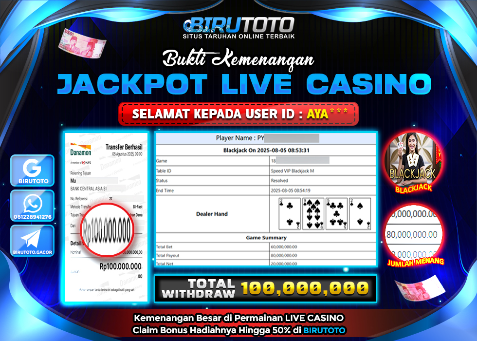 Selamat Kepada Member BIRUTOTO AY**** Telah Jackpot Di LIVE CASINO BLACKJACK LOBBY