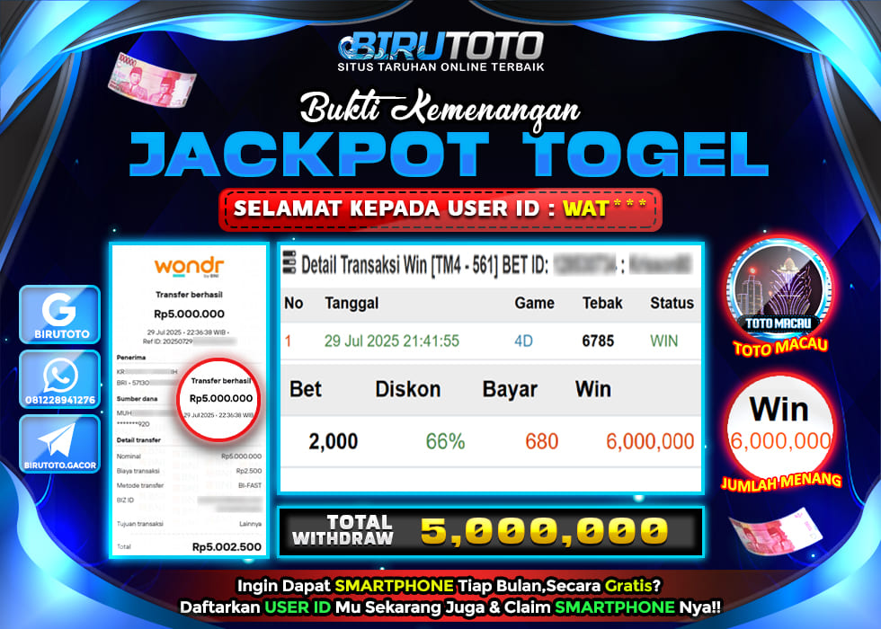 Selamat Kepada Member BIRUTOTO WA**** Telah Jackpot Di TOGEL TOTO MACAU