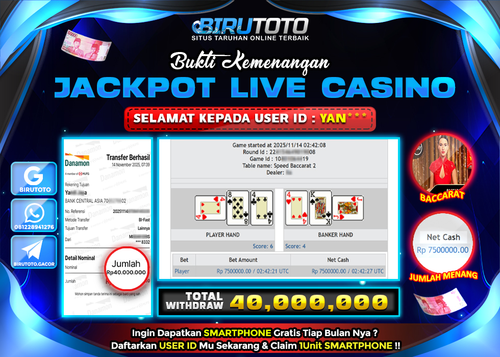 Selamat Kepada Member BIRUTOTO YA**** Telah Jackpot Di LIVE CASINO BACCARAT