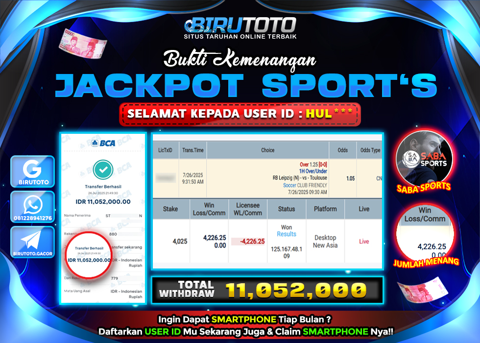 Selamat Kepada Member BIRUTOTO HU**** Telah Jackpot Di SPORT SABA SPORTS SOCCER
