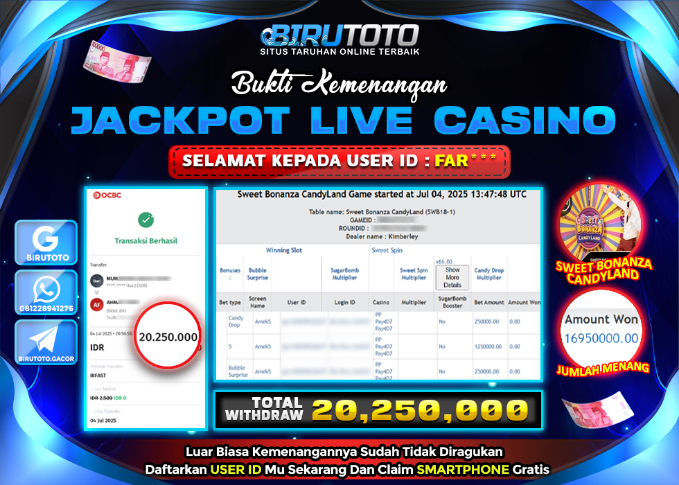 BIRUTOTO JACKPOT LIVE CASINO SWEET BONANZA CANDYLAND Rp.20.250.000 LUNAS