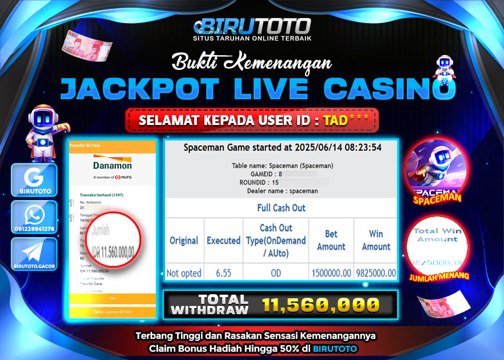 BIRUTOTO JACKPOT LIVE CASINO SPACEMAN Rp.11.560.000 LUNAS