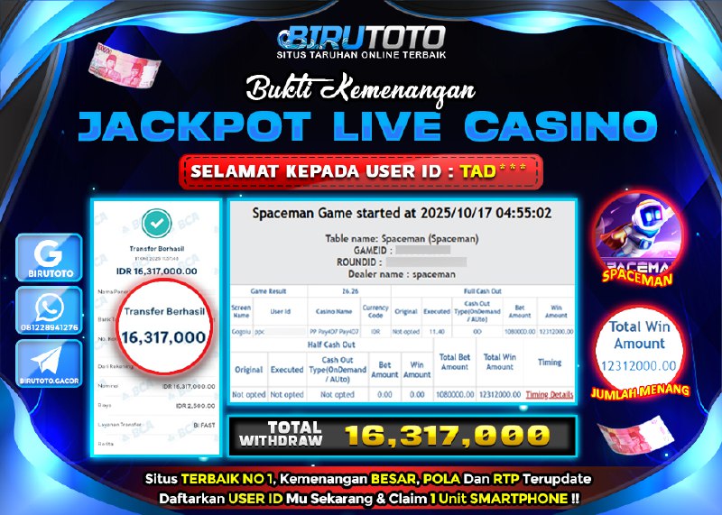 BIRUTOTO JACKPOT LIVE CASINO SPACEMAN Rp.16.317.000 LUNAS