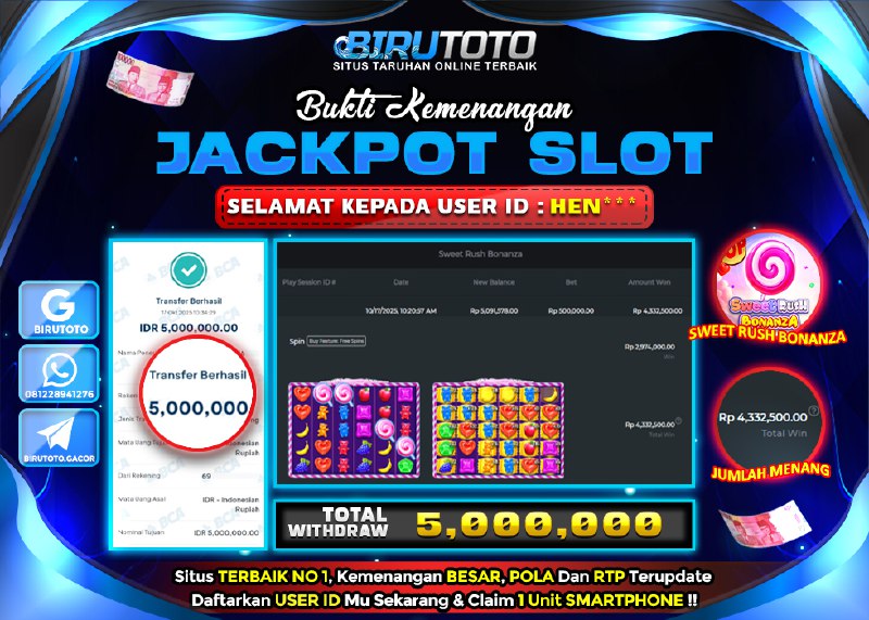 BIRUTOTO JACKPOT SLOT SWEET RUSH BONANZA Rp.5.000.000 LUNAS