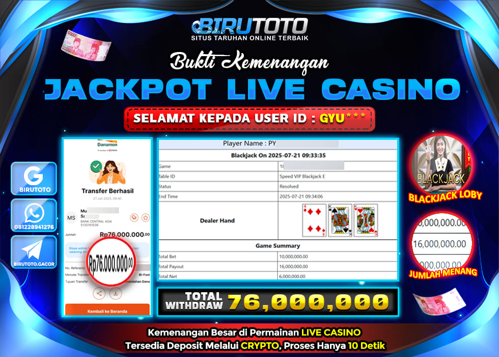 BIRUTOTO JACKPOT LIVE CASINO BLACKJACK LOBBY Rp.76.000.000 LUNAS