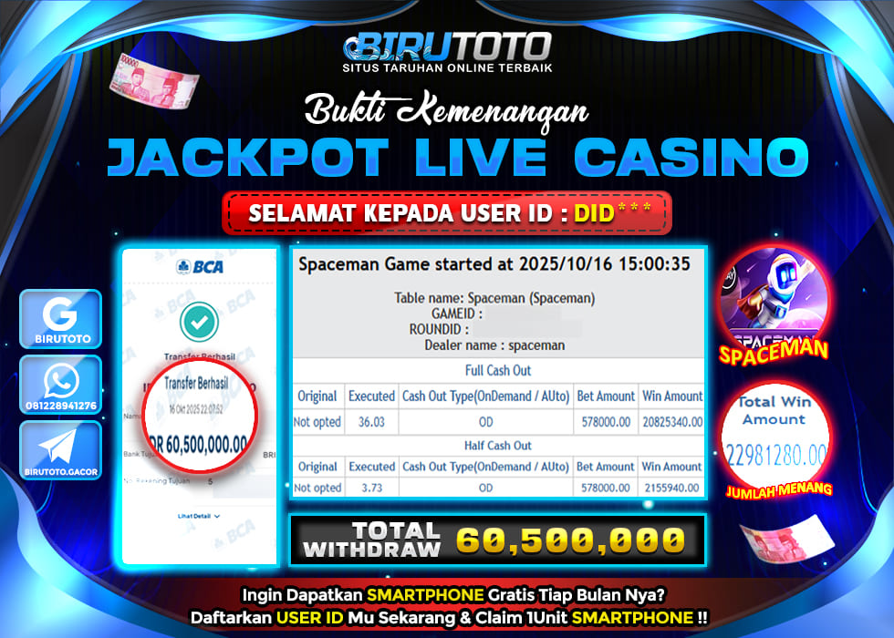 BIRUTOTO JACKPOT LIVE CASINO SPACEMAN Rp.60.500.000 LUNAS