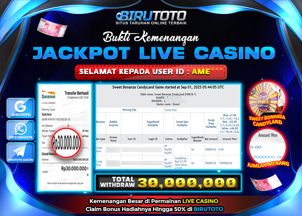 BIRUTOTO JACKPOT LIVE CASINO SWEET BONANZA CANDYLAND Rp.30.000.000 LUNAS