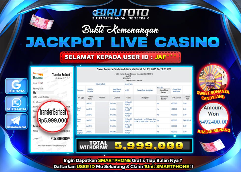 BIRUTOTO JACKPOT LIVE CASINO SWEET BONANZA CANDYLAND Rp.5.999.000 LUNAS