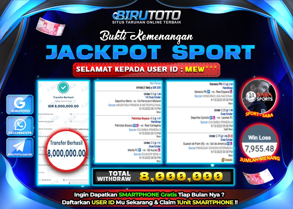 BIRUTOTO JACKPOT SABA SPORT Rp.8.000.000 LUNAS