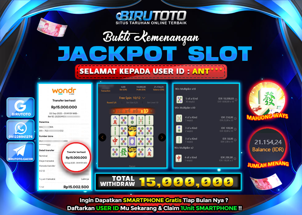 BIRUTOTO JACKPOT SLOT MAHJONG WAYS Rp.15.000.000 LUNAS