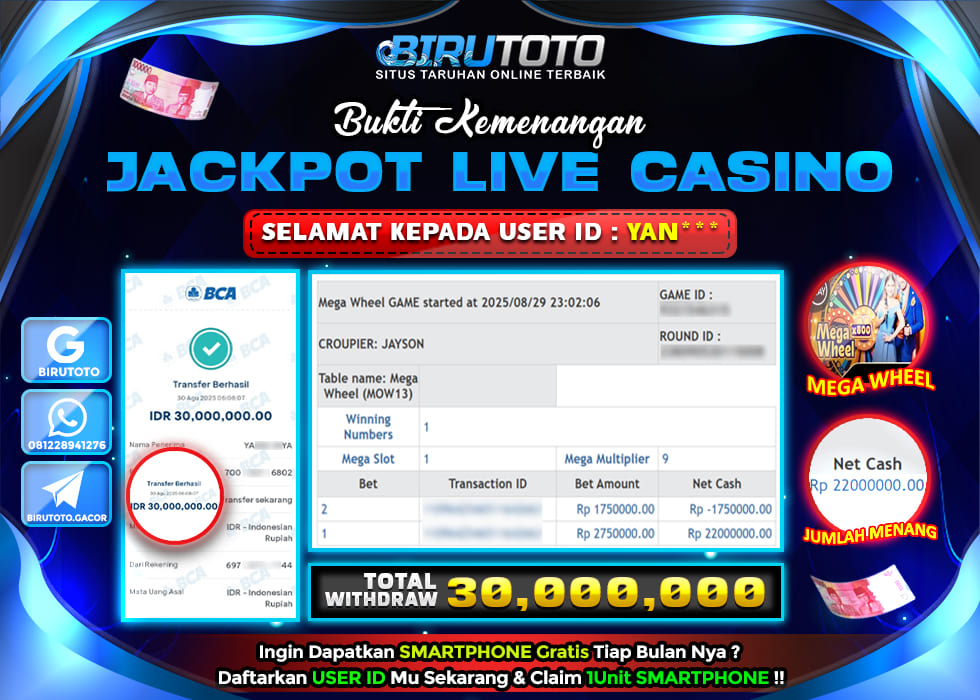 BIRUTOTO JACKPOT LIVE CASINO MEGA WHEEL Rp.30.000.000 LUNAS