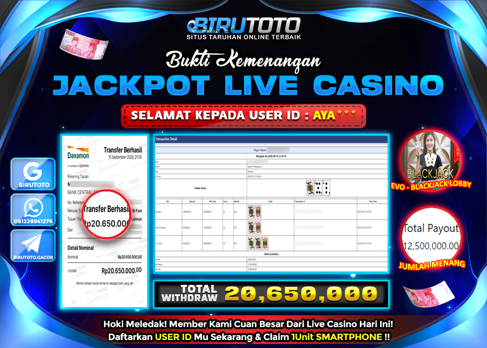 BIRUTOTO JACKPOT LIVE CASINO BLACKJACK LOBBY Rp.20.650.000 LUNAS