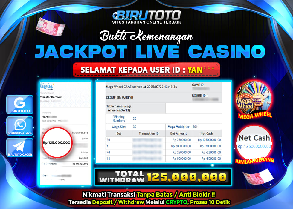 Selamat Kepada Member BIRUTOTO YA**** Telah Jackpot Di LIVE CASINO MEGA WHEEL