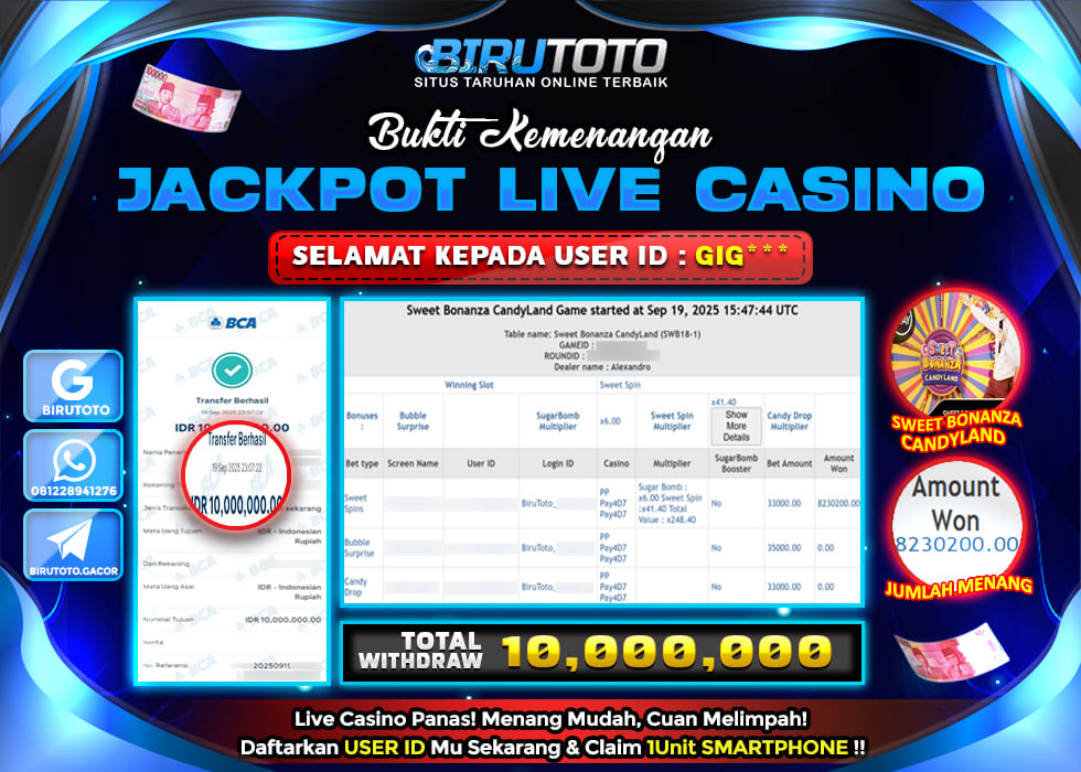 BIRUTOTO JACKPOT LIVE CASINO SWEET BONANZA CANDYLAND Rp.10.000.000 LUNAS