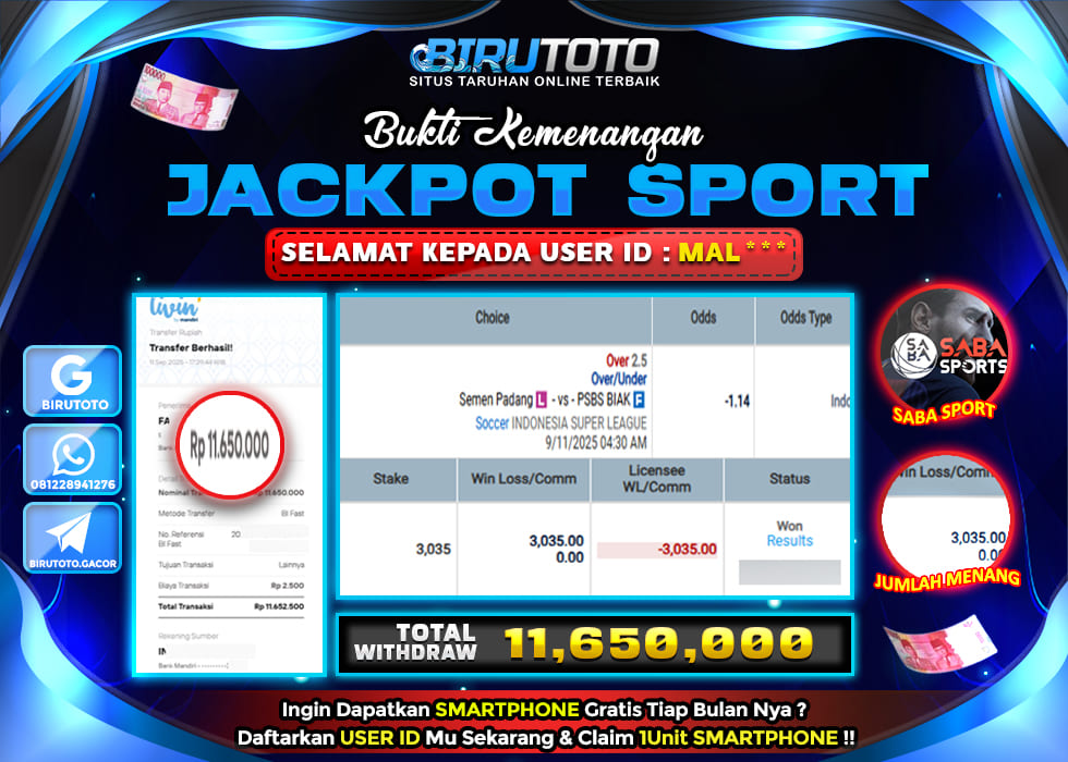 BIRUTOTO JACKPOT SPORT SABA SPORTS Rp.11.650.000 LUNAS