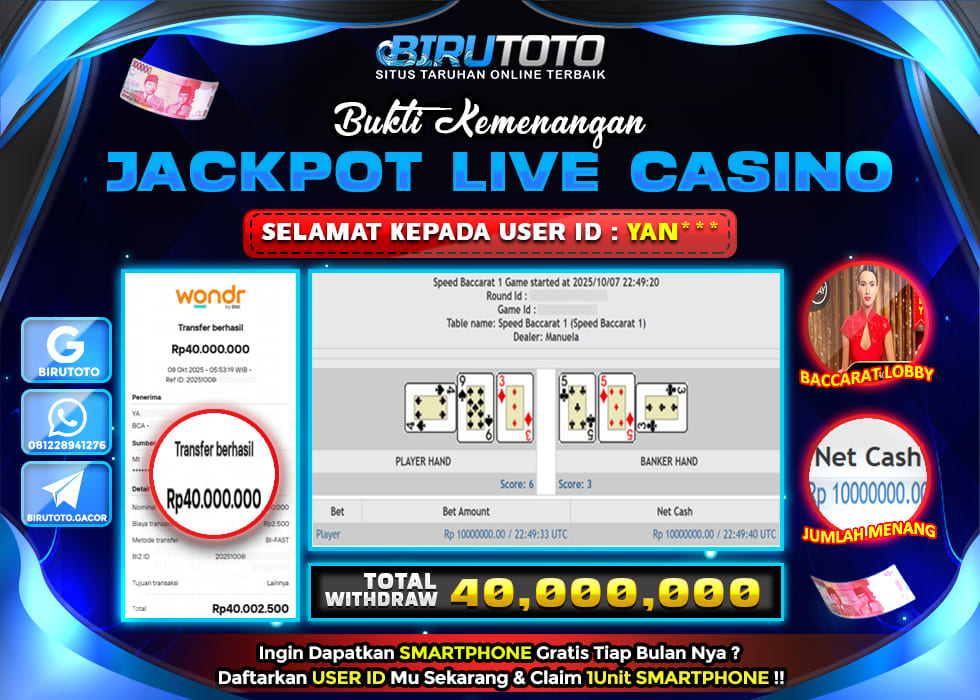 BIRUTOTO JACKPOT LIVE CASINO BACCARAT Rp.40.000.000 LUNAS
