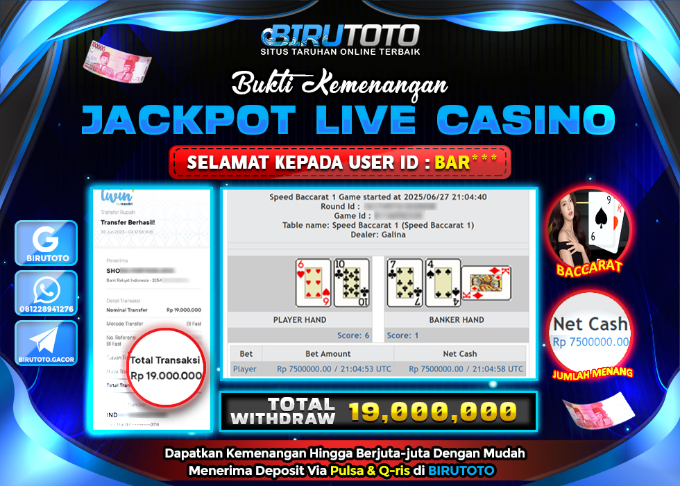 BIRUTOTO JACKPOT LIVE CASINO BACCARAT Rp.19.000.000 LUNAS