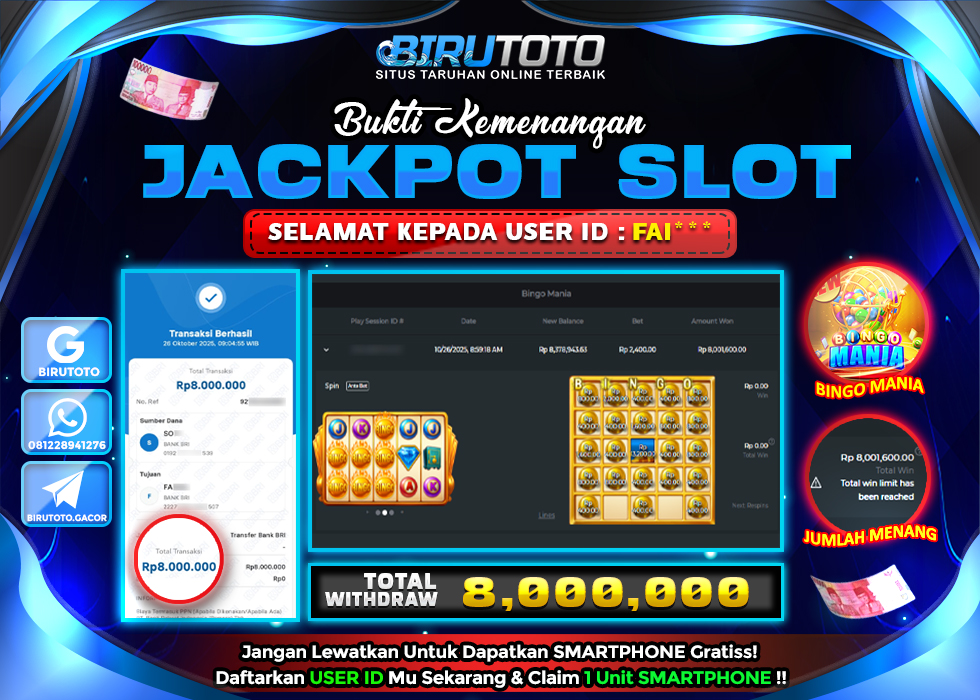 Selamat Kepada Member BIRUTOTO FA**** Telah Jackpot Di SLOT BINGO MANIA