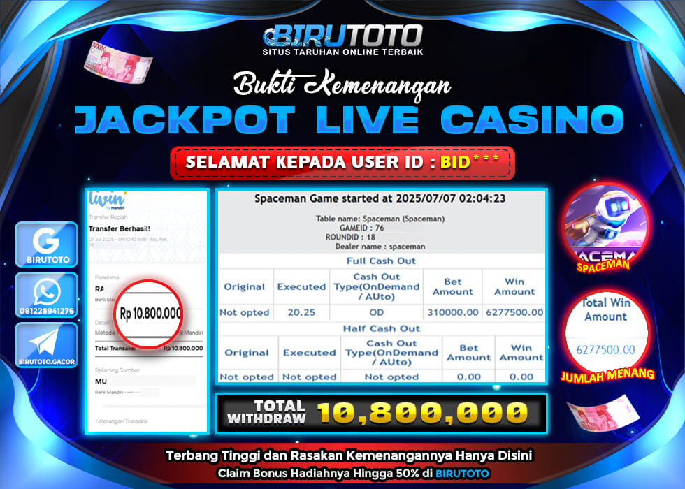 BIRUTOTO JACKPOT LIVE CASINO SPACEMAN Rp.10.800.000 LUNAS
