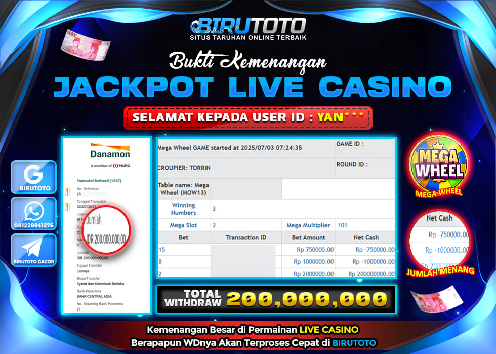 BIRUTOTO JACKPOT LIVE CASINO MEGA WHEEL Rp.200.000.000 LUNAS