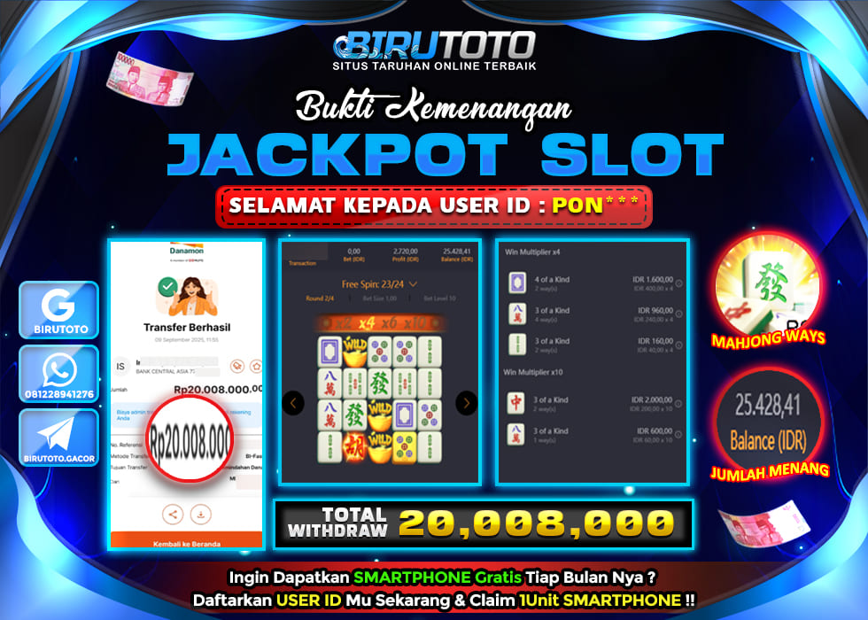 BIRUTOTO JACKPOT SLOT MAHJONG WAYS Rp.20.008.000 LUNAS