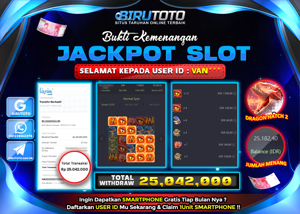 BIRUTOTO JACKPOT SLOT DRAGON HATCH 2 Rp.25.042.000 LUNAS