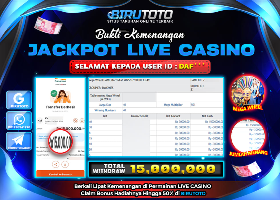 BIRUTOTO JACKPOT LIVE CASINO MEGA WHEEL Rp.15.000.000 LUNAS