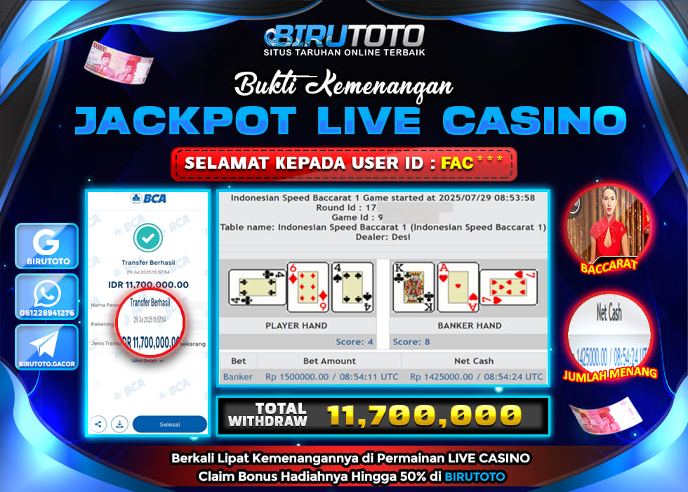 BIRUTOTO JACKPOT LIVE CASINO BACCARAT Rp.11.700.000 LUNAS