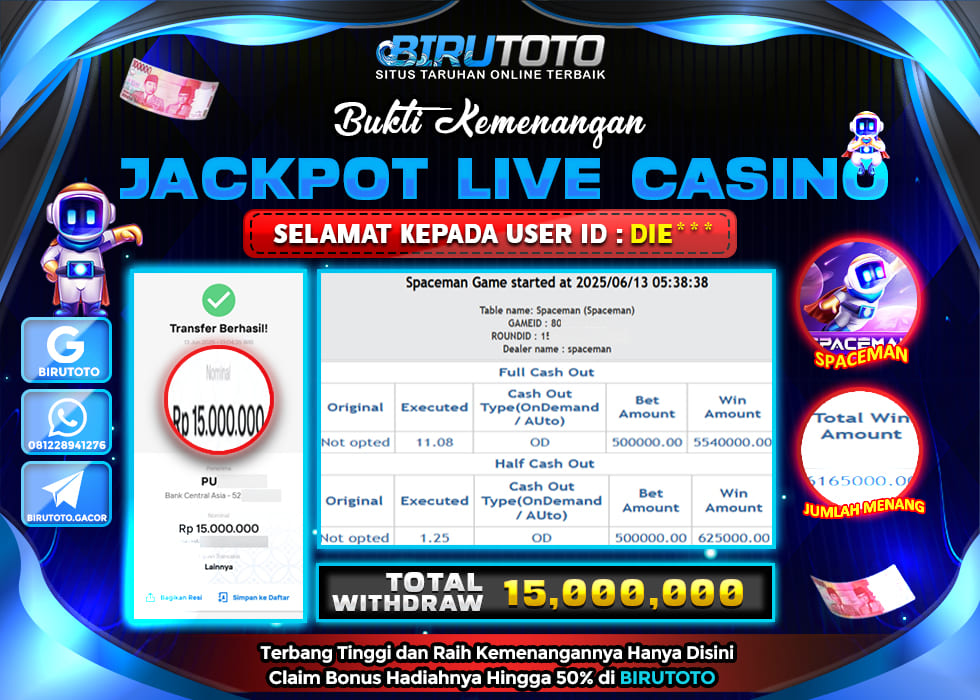 BIRUTOTO JACKPOT LIVE CASINO SPACEMAN Rp.15.000.000 LUNAS